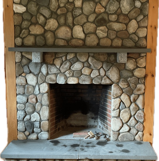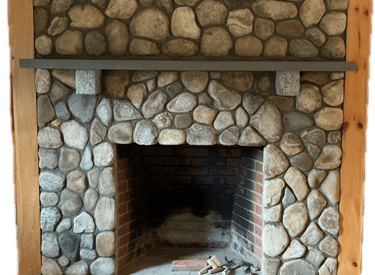 Never look at old bricks by installing a stone veneer river rock over brick for a Fireplace Makeover. (Barnstable County) Cape Cod only
